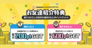 DMMポイントクラブの「お友達紹介特典」は、これからDMMポイントクラブアプリを利用する人が、紹介コードを入力して条件を達成するだけで、最大600ポイントの特典を受け取れる仕組みです。